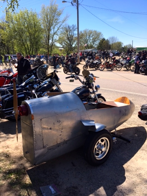 The Blues Project and I arrived in Leland, WI around 2:00 pm and I strolled around to see what's what. The most interesting item (to me) was the absolutely beautiful VFR1000R pictured above. I chatted with the owner and picked up a few details, though I totally missed his name. The bike has original paint and mufflers, and he even sprung for Arai's matching Fast Freddie commemorative helmet. Very nice. The Crud Run has managed to preserve its down-home flavor and stave off tacky commercialism for all these years, but the appearance of this T-shirt vendor can only mean the beginning of an ever-expanding biker's flea market. It's probably only a matter of time till the molded ear plug and doo-rag booths show up. And that will be the end, at least for me. Heck, someone's even given the run its own web site. The county gendarme have discovered easy pickins' on the first Sundays in May and October, though they've taken to simply parking in the midst and strolling the grounds on foot. This interesting side hack outfit also caught my attention — the propeller is particularly intriguing (click on an image to enlarge). Everyone began to trickle away around 3:30 so I saddled up and headed home...the long way.